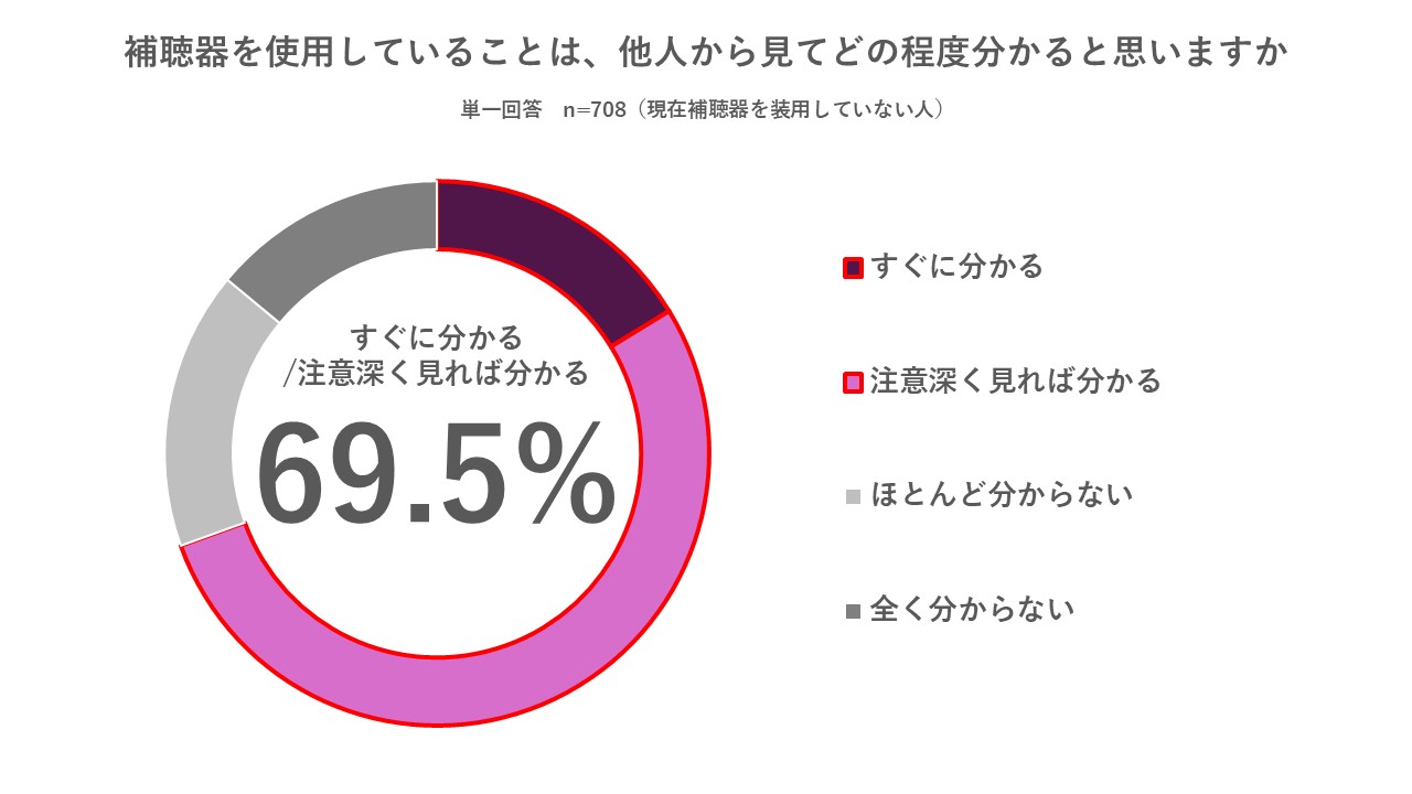 補聴器の使用は他人から見て分かると思うか聞いたところ、69.5%が「分かる」と回答。しかし、最新モデルの補聴器を装用した写真を見せると84.0%が「目立たない」と回答し(「思っていたより目立たない」73.0%+「やや目立たない」14. 8%)、先入観と実態の間に大きなギャップがあることが明らかになりました。
